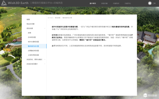 Wish3D Earth三维旧城改造方案展示平台支持上传同一项目所做的多个改造方案。每个方案从规划总图、土地利用规划图、改造内容、改造成本测算等方面进行介绍,便于领导快速抓住改造方案的要点。